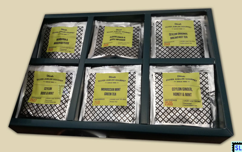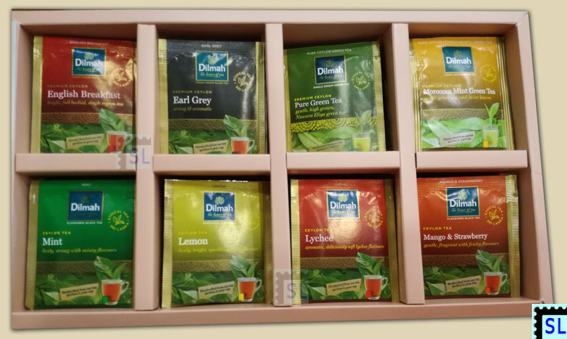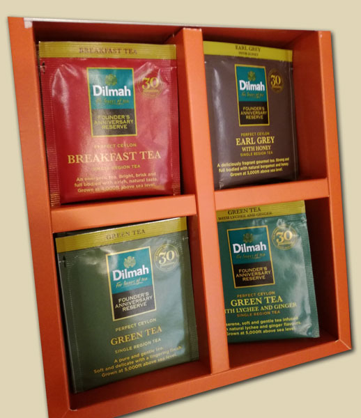 Brilliant breakfast, Ceylon Young Hyson green tea, Nuwaraeliya Pekoe, the original earl grey, Ceylon cinnamon spice & Moroccan mint green tea bags individually wrapped for taste and goodness.